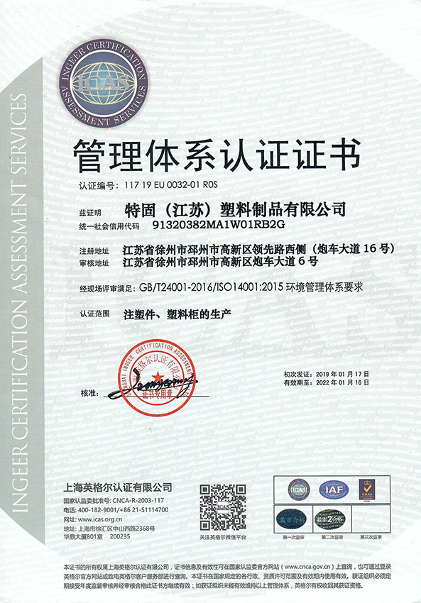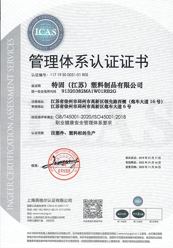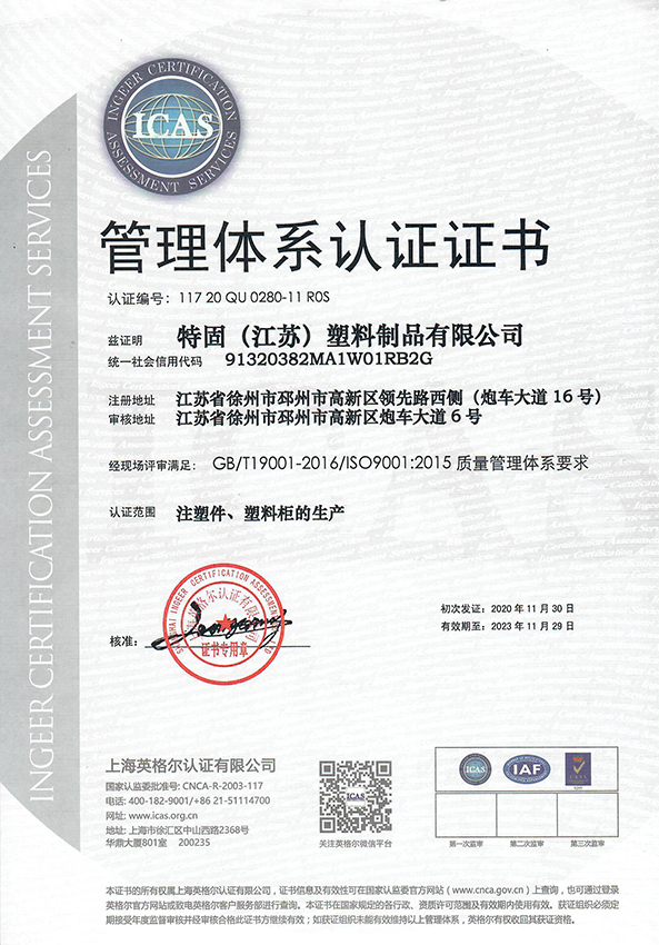 2018年特固工廠坐落于江蘇省徐州市邳州高新區(qū)炮車大道6號(hào),全國(guó)18家特固分公司,工廠占地面積60000平方米,擁有6棟廠房,注塑機(jī)共15臺(tái),員工人數(shù)50余人,每年生產(chǎn)和銷售置物柜數(shù)量超過(guò)40萬(wàn)門,更衣柜產(chǎn)品的年銷售額超過(guò)8000萬(wàn)元。已通過(guò)ISO9001質(zhì)量管理體系、ISO14001環(huán)境管理體系、ISO28001職業(yè)健康管理體系!